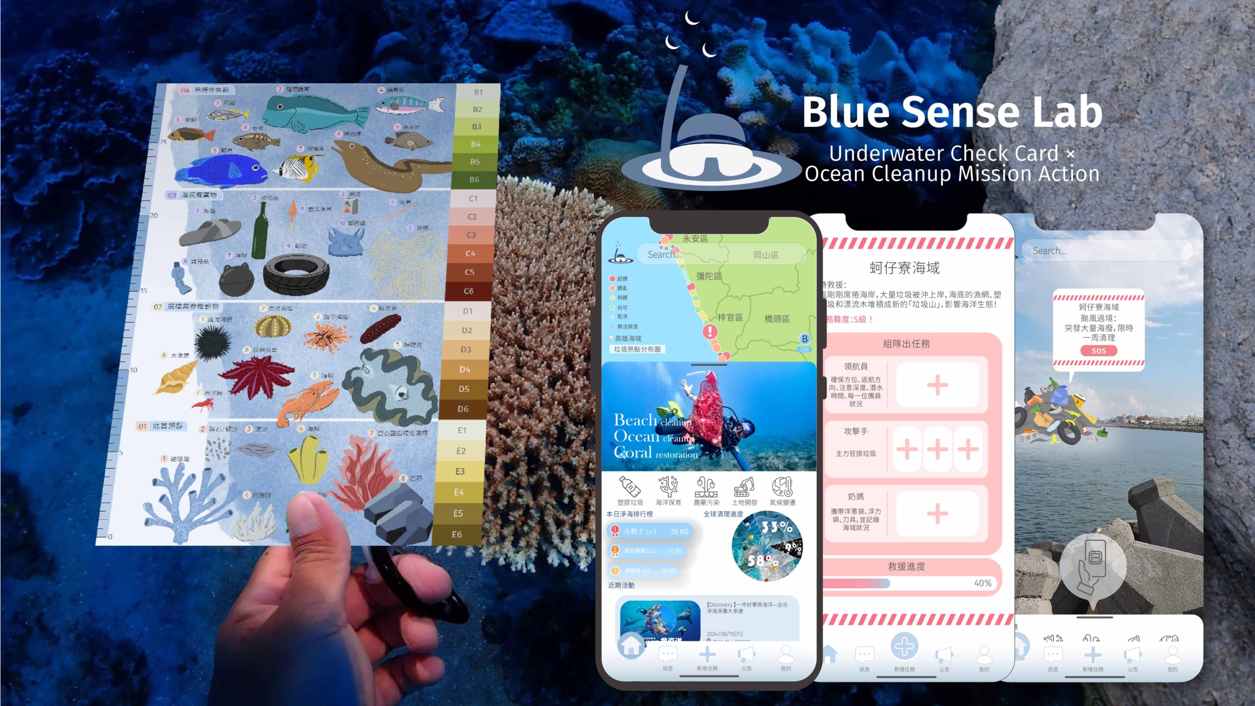 鑑於海底大型廢棄物難以定位,以及潛水員入水回收風險高與缺乏垃圾回報管道等問題,團隊透過訪談潛水專家,研究並設計「Blue Sense Lab」海洋保育行動系統,結合 AR 任務化 APP 與海底健檢卡,分析潛水路徑與垃圾分佈熱點。潛水員打開系統領取任務後,可選擇個人或組隊執行;潛入海中後,可搭配海底健檢卡指示,紀錄海底垃圾種類與生態指標,並標注大型廢棄物位置;上岸後,潛水員透過系統掃描健檢卡與打撈垃圾,將自動分析廢棄物重量與生態指數等,並給予回饋成就值。透過回報系統的整合,潛水員快速標記海廢熱點和珊瑚生態,提升淨海效率並即時統整海域環境狀況。